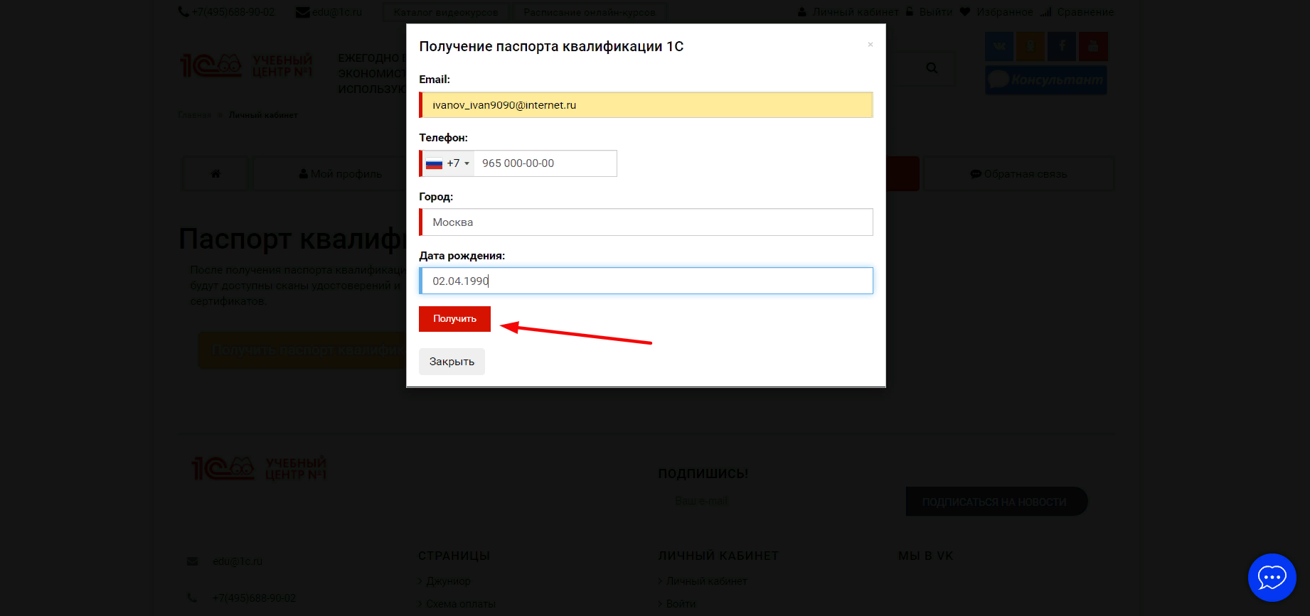 Далее, в окне «Получение паспорта квалификации 1С» необходимо заполнить личную информацию и нажать на кнопку Получить
